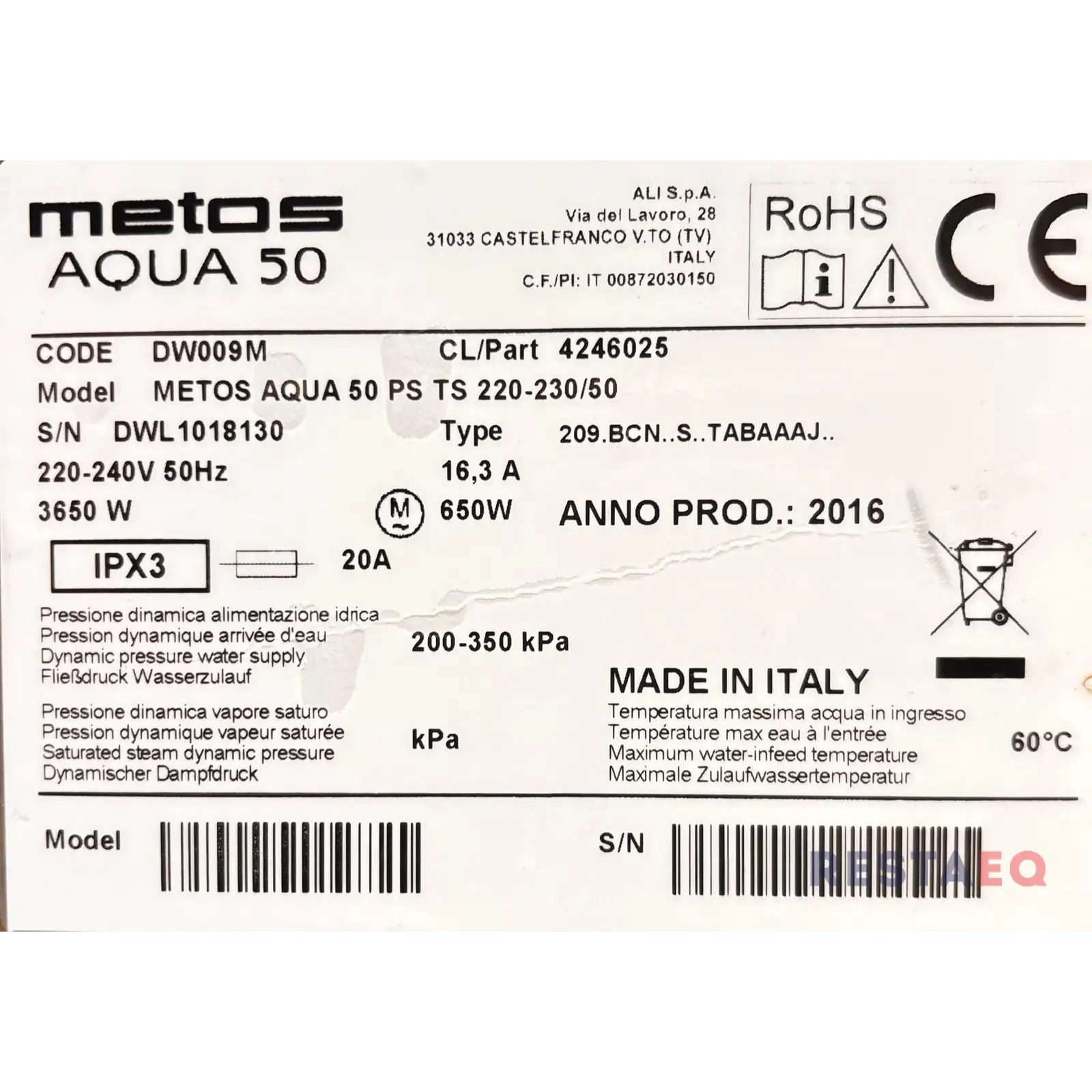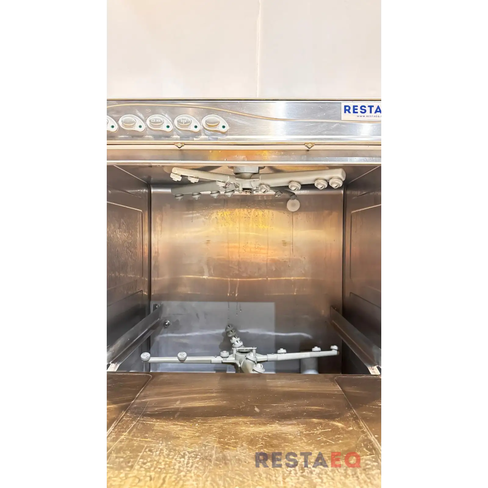 Kone on säädetty RestaEQ Konetiskiaine 100:lle ja RestaEQ KW Huuhtelukirkasteelle. Koneen mukana tulee 10L pesuainetta ja 5L huuhtelukirkastetta.