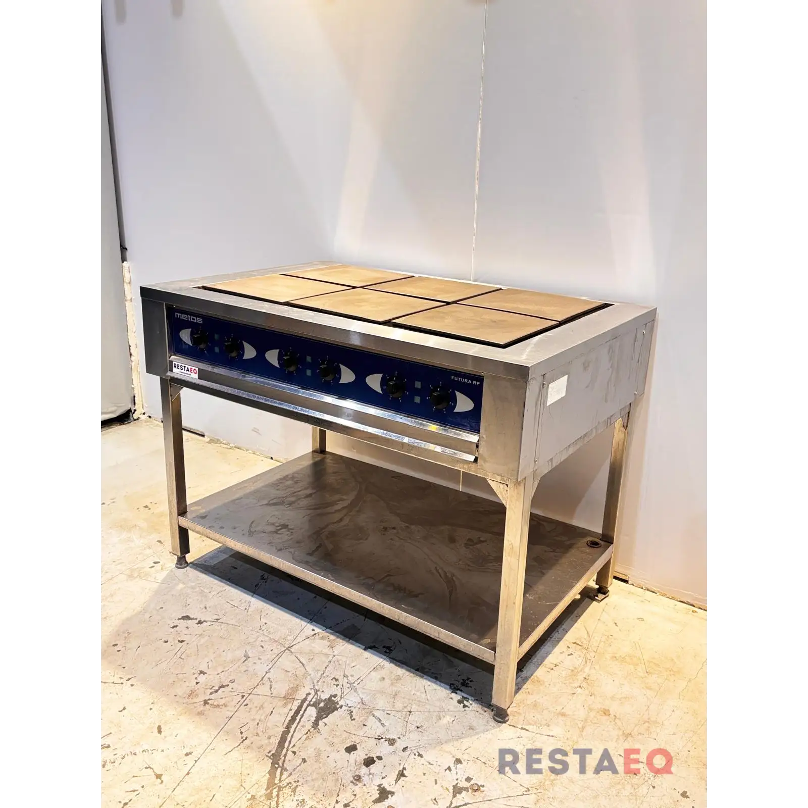 Valurautaiset keittolevyt, ulkovuoraus ruostumatonta terästä. Kuusi 3 kW:n keittolevyä, 300x300 mm